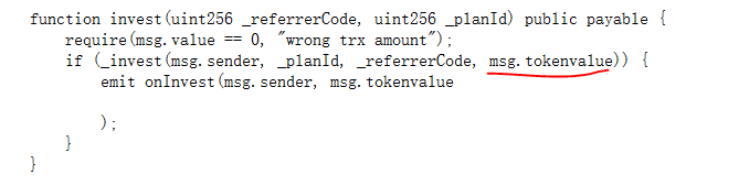 经过分析发现,该假币漏洞是由于invest函数只判断了msg.tokenvalue,而没有判断msg.tokenid是否为真实BTT代币的ID:1002000所导致。