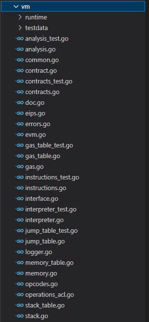 EVM的核心代码在core/vm下,而在进入到EVM之前的处理,我们会在第二章讲到,我们这里只分析EVM的层次结构。