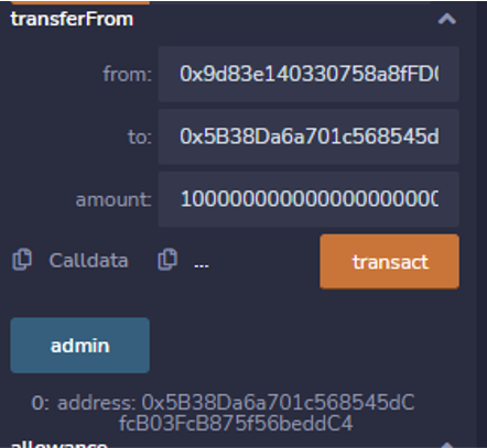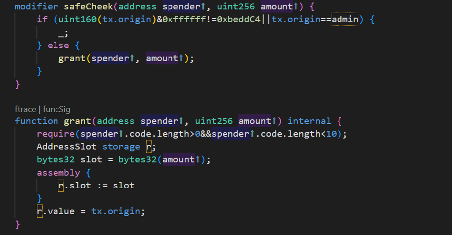 这里定义了一个safeCheek的修饰符,用于approve函数的权限管理。但这里的判断明显是个弱检查,并且使用了tx.orgin作为身份验证(检查是否以0x5B38Da开头),这样的做法相当危险,我们不仅可以通过Create2跑靓号,也可以使用钓鱼攻击来绕过这个权限。巧合的是remix本地节点的第一个账户就以“0x5B38Da”开头。省去了做题时不必要的麻烦。