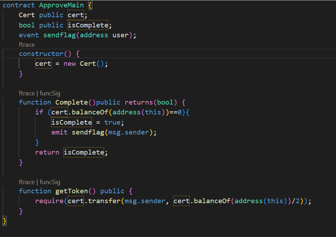 此题的Cert是一个实现了所有基础功能的代币合约,在创建此token时,自动获得100ETH